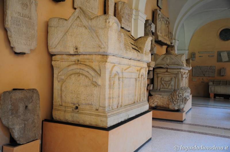 There are sarcophagus, columns, Roman inscriptions, sometimes taken during the Middle Ages by noble families. The famous stone column, once in via Farini°, is also here. Choirs and sculptures dating back from the 13th to the 17th centuries are in the Museum as well. In the second courtyard, under a glass ceiling, there is the Roman Lapidary Museum, where a beautiful mosaic from a Roman domus and the Vetilia ara stand. This one is an important monument of the Roman era, perfectly preserved and found not many years ago during some building works.