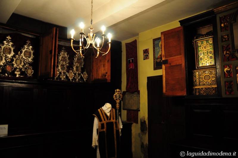 Si tratta dell’unica chiesa modenese che non sia annessa ad altri edifici. Dalle armoniche linee, tipicamente neoclassiche, il disegno della cappella è di Girolamo Frigimelica Roberti. L’interno è a pianta circolare; la lanterna raggiunge i 22 metri di altezza. La cantoria con l’organo settecentesco di Agostino Traeri occupa la controfacciata. Presso il coro si segnala la Decollazione del Battista di Francesco Vellani (XVIII sec.); nella cappella a sinistra, commissionata dalla corporazione dei calzolai, tela del 1734 di Antonio Consetti (da notare sullo sfondo la montagna che prende il volo retta da angeli); in quella di destra, del 1723, sempre di Antonio Consetti, Madonna e Santi commissionata dalla corporazione dei cocchieri (il cancelletto è del Malagoli). Appese alle pareti stanno numerose aquile estensi. A destra dell’altare la Madonna della Mercede o delle Catene è del 1897. Ma l’attrazione più significativa della chiesa è il Compianto su Cristo morto di Giudo Mazzoni: risalendo al 1479, si tratta della più antica opera del genere al mondo. Intense le espressioni dei soggetti (con ogni probabilità copiati da modelli vivi al tempo) e la drammaticità della scena.