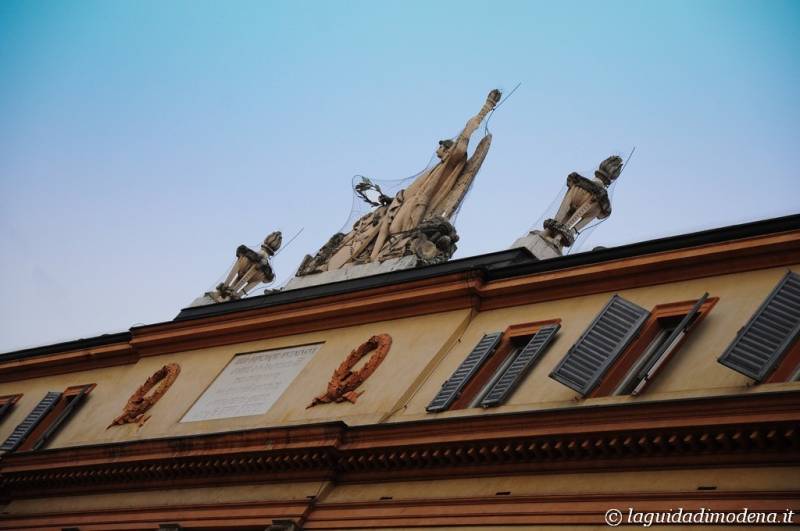 Il grande Teatro Comunale di Modena venne costruito dal 1841, sotto il ducato di Francesco IV, secondo i progetti di Francesco Vandelli. L’armonica facciata su corso Canal Grande°° si caratterizza per il porticato con quattro colonne e balcone in corrispondenza dell’ingresso principale e per i rilievi di Luigi Righi. Più in alto, una lapide ne ricorda la fondazione, mentre al culmine una statua conclude il fronte.